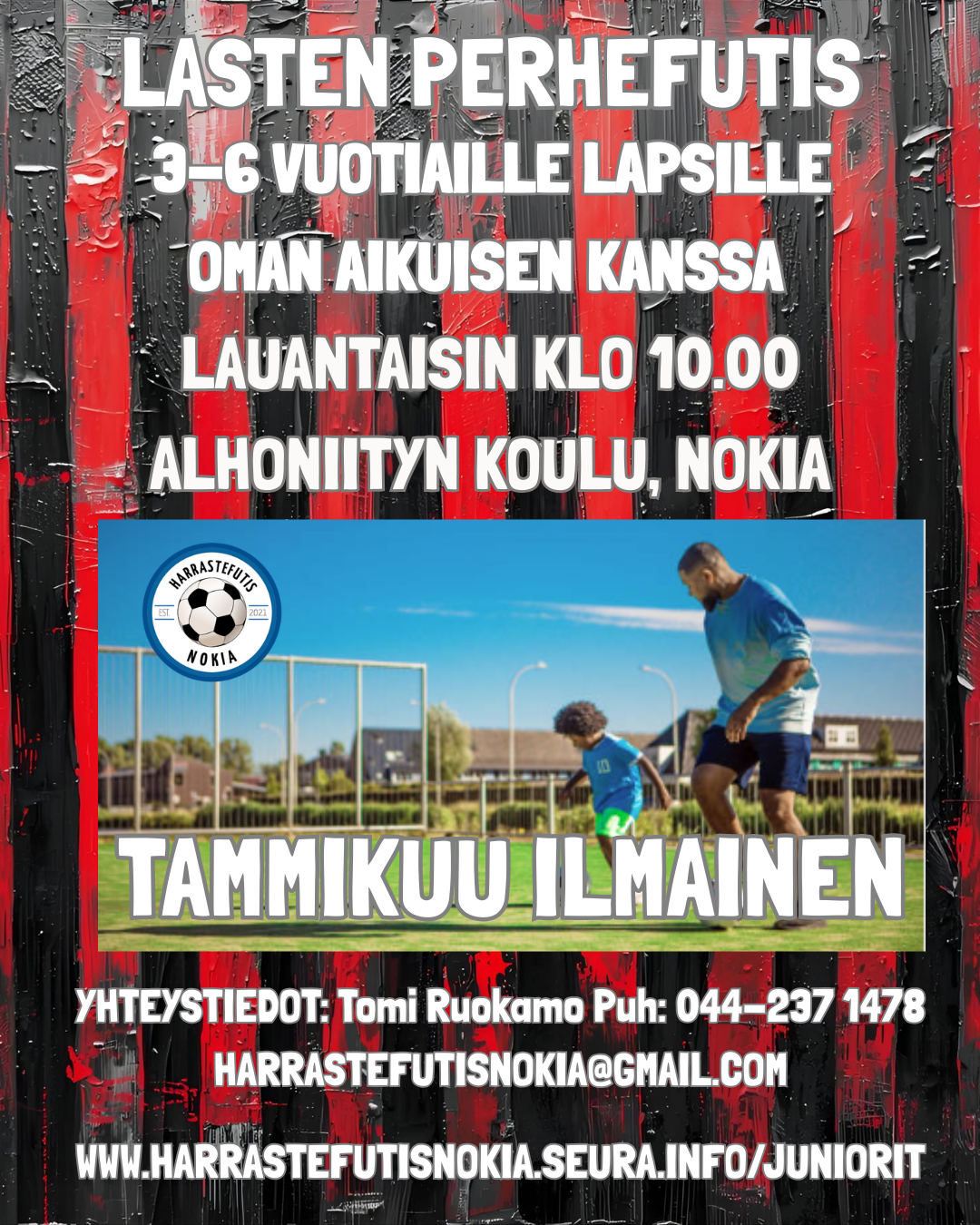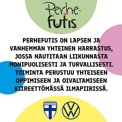 Perhefutis on tarkoitettu 3-6 vuotiaille lapsille yhdessä oman aikuisen kanssa. Aikuinen voi olla vanhempi, isovanhempi tai muu tuttava/sukulainen. Keskeisenä teemana on lapsen ja aikuisen vuorovaikutuksen kehittäminen pelin ja leikein. Seuran puolesta tarjoamme käyttöön harjoituksen ohjauksen ja harjoitteluun tarvittavat varusteet ( pallot ja liivit).